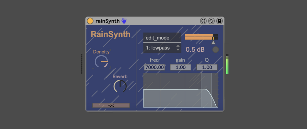 You can control the rain sound by controlling the density of the rain, the magnitude of the reverberation, and the filter type and coefficients. The rain in the UI changes according to your operations.